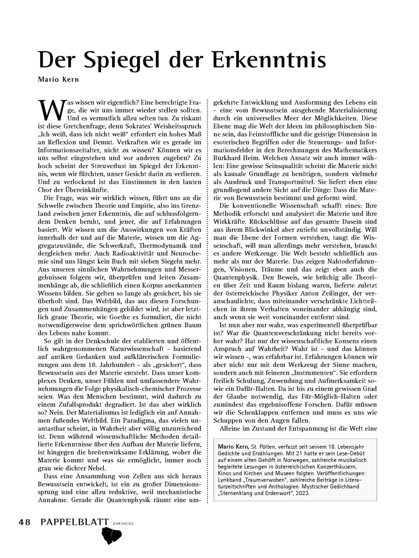 „Spiegel der Erkenntnis“, erschienen im Pappelblatt 30 (2023):