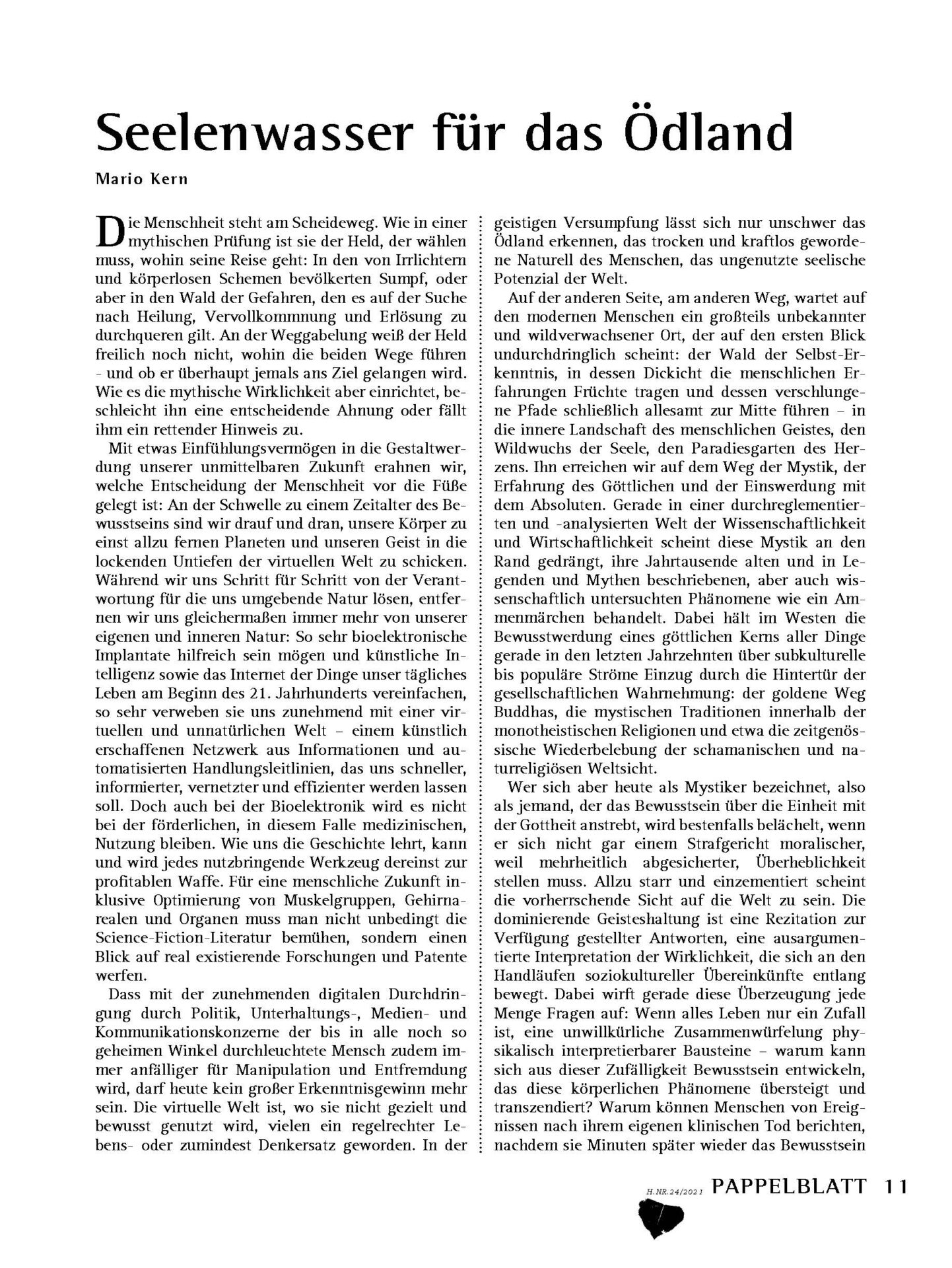 „Seelenwasser für das Ödland“, erschienen im Pappelblatt 24 (2021):